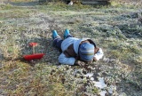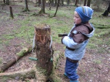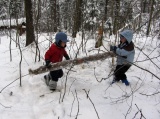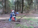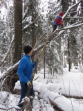 Дима пытается палкой согнать Яшу с дерева.