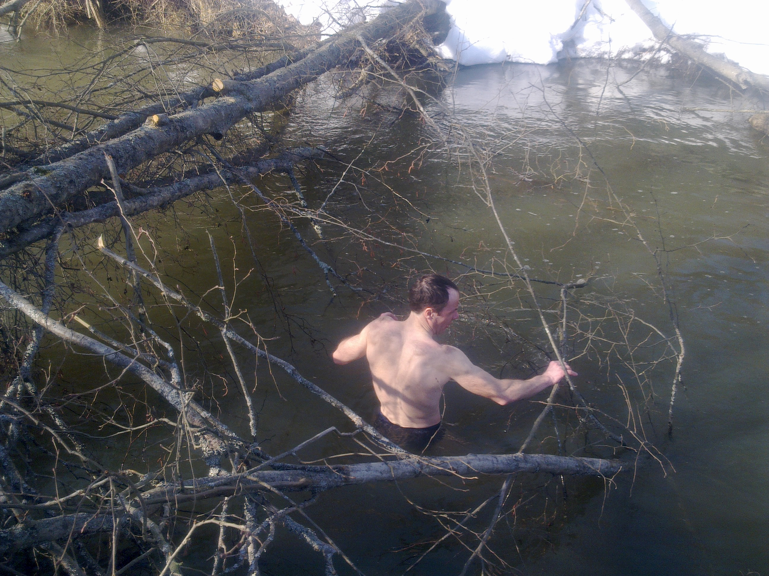 Антон пытается выловить упавшую в воду пилу.