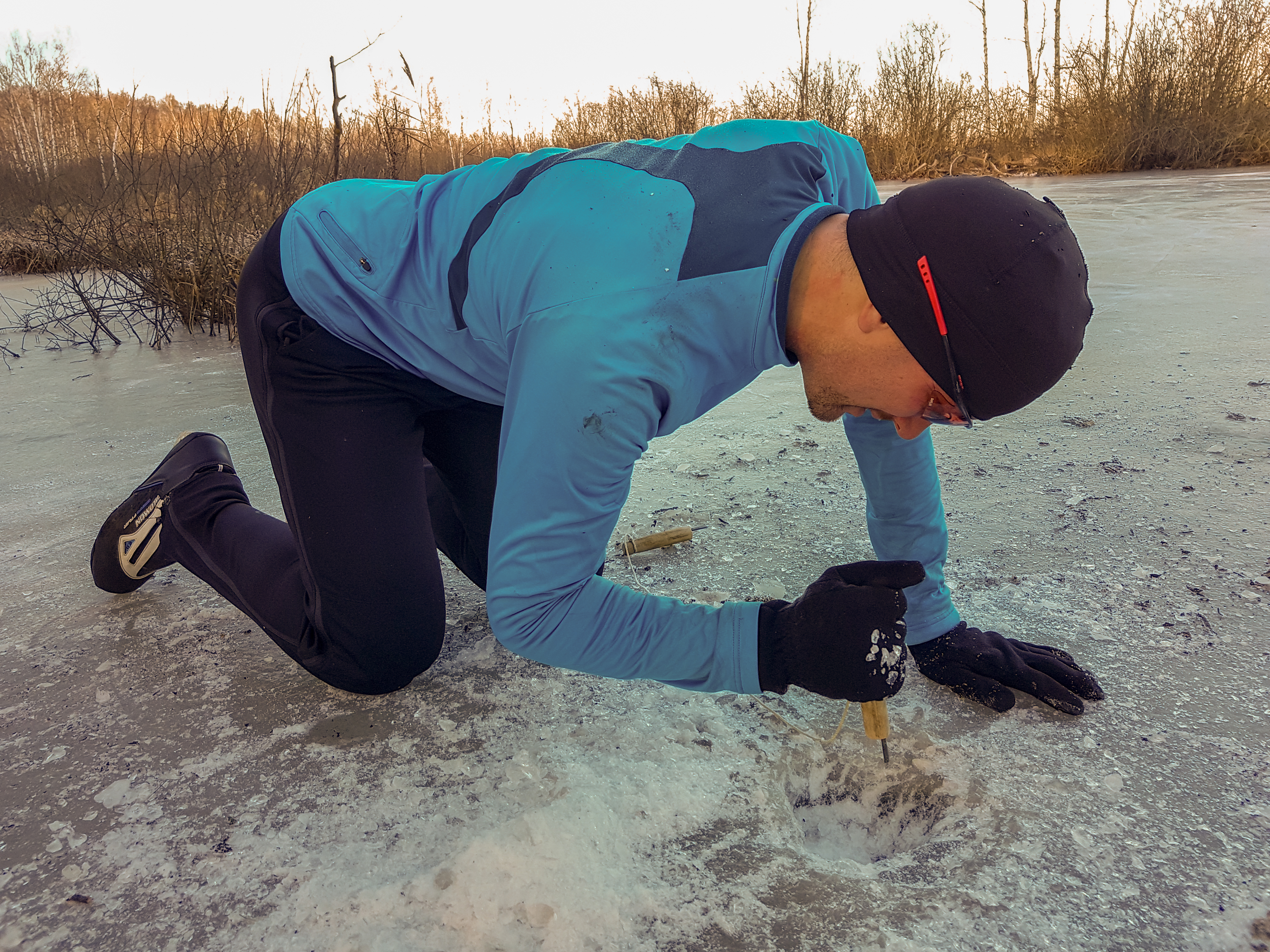 За ночь вчерашняя лунка для добычи воды затянулась льдом. Вот и шильца пригодились!