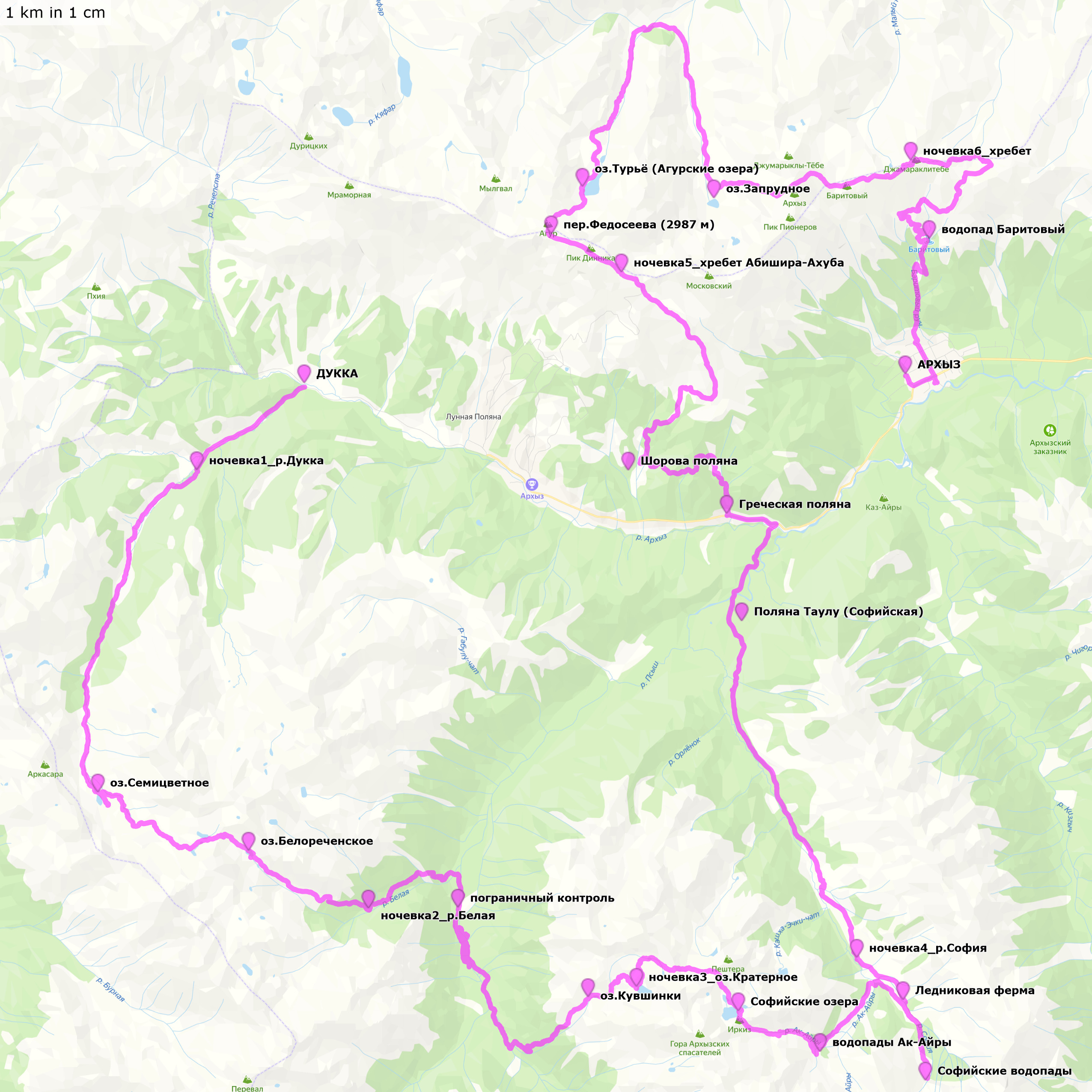 Прошли 97,3 км (2,8+16,4+13,3+15,1+21,5+16,9+11,3) Дукка - озеро Семицветное - перевал Айюлю (2850 м) - озеро Белореченское - река Белая - Псыш - река Псыш - озеро Кувшинки - озеро Кратерное - перевал Кара-Джаш (3024 м) - перевал Кёль-Ауш (2900 м) - Софийские озёра - перевал Иркиз (2870 м) - водопады Ак-Айры - река Ак-Айры - Ледниковая ферма - Софийские водопады - река София - Поляна Таулу (Софийская) - Греческая поляна - хребет Абишира-Ахуба (высота 3000 м) - перевал Федосеева (2987 м) - озеро Турьё (Агурские озера) - река Кяфар-Агур - озеро Запрудное - хребет Абишира-Ахуба (3000 м) - перевал Баритовый (2809 м) - перевал Кяфарский Малый (2730 м) - водопад Баритовый - Архыз Треки по дням и точки nakarte Трек и точки (файлы .gpx для скачивания) Отчет в Strava Отчет в моём ЖЖ (текст из "Стравы" плюс фотки) Фото и видео Андрея Сашина Некоторые мои и не мои фото в моём ФБ |