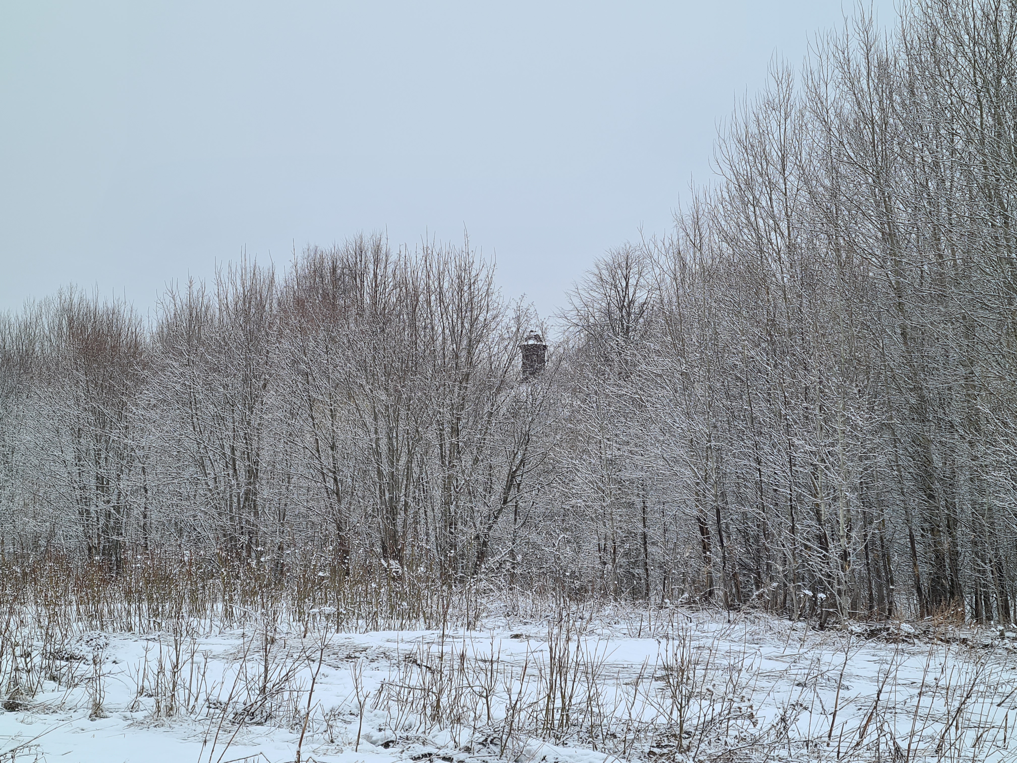 За деревьями виден купол церкви.