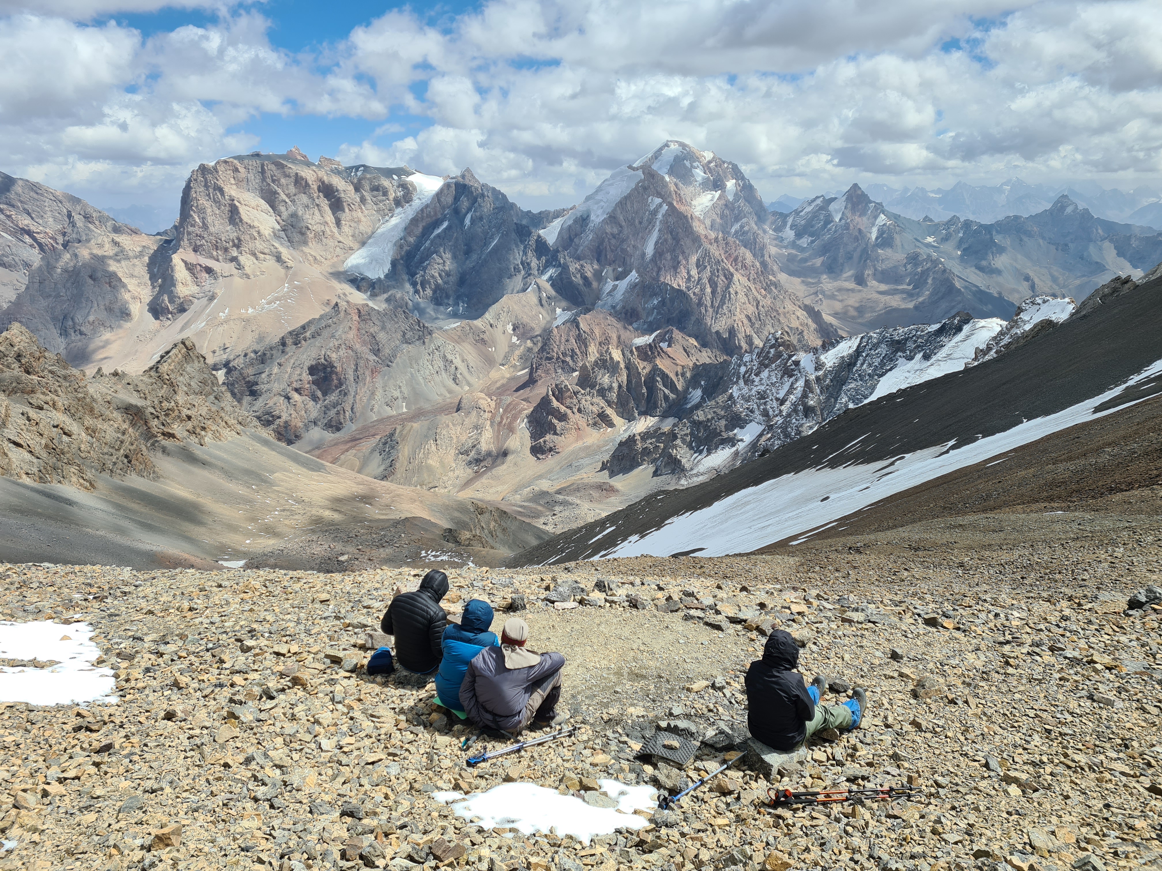 4 сентября 2023. Под перевалом Чимтарга ждем Андрея и Сашу, которые снимают веревки, оставленные вчера на склоне Энергии.