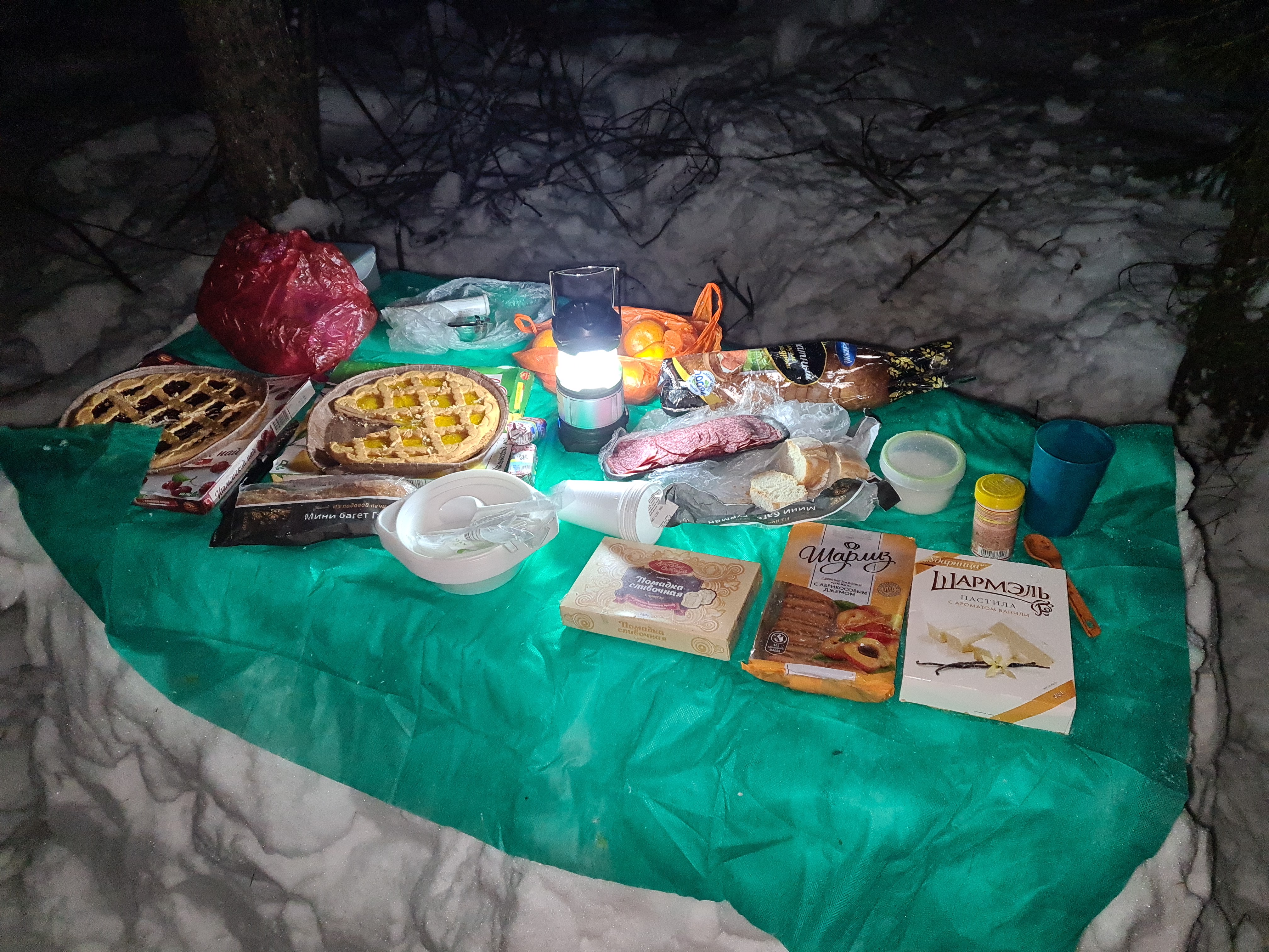 Стол на финишном костре. В кадр не попали гречка с тушенкой, клюквенный морс и чай.