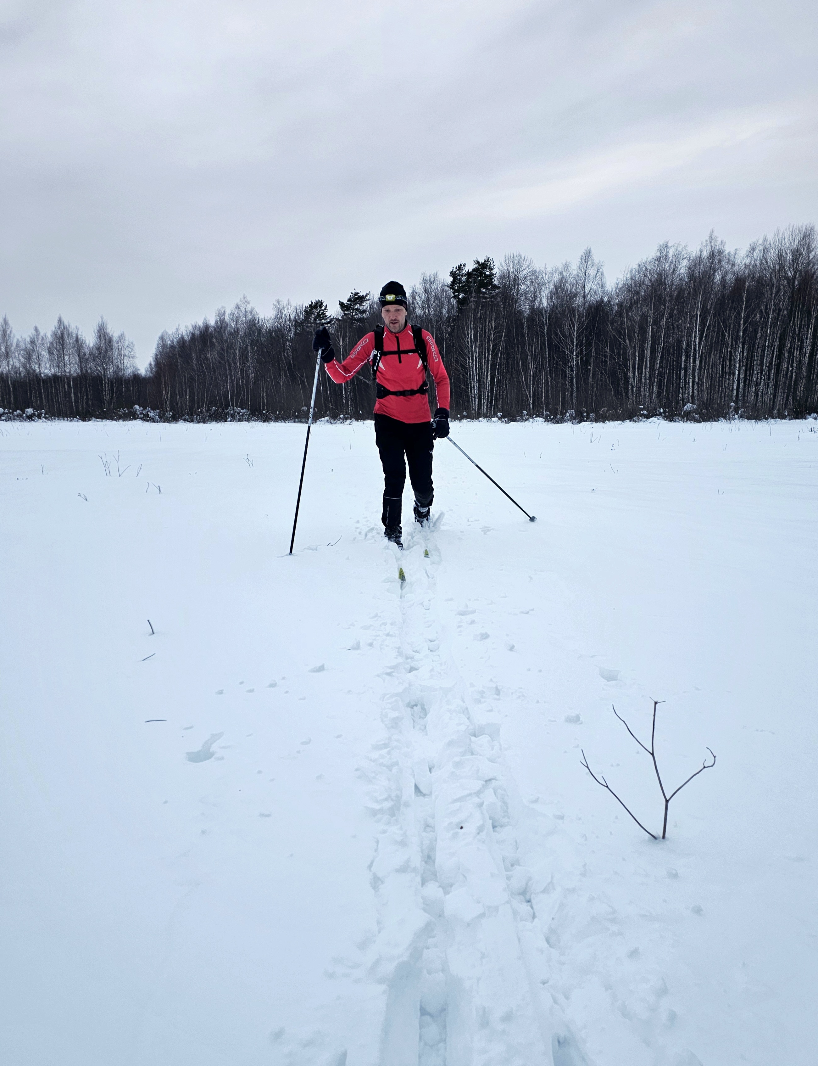 22 февраля 2026. Выходим с места привала. Пока мы отдыхали, наши следы в поле почти полностью замело.