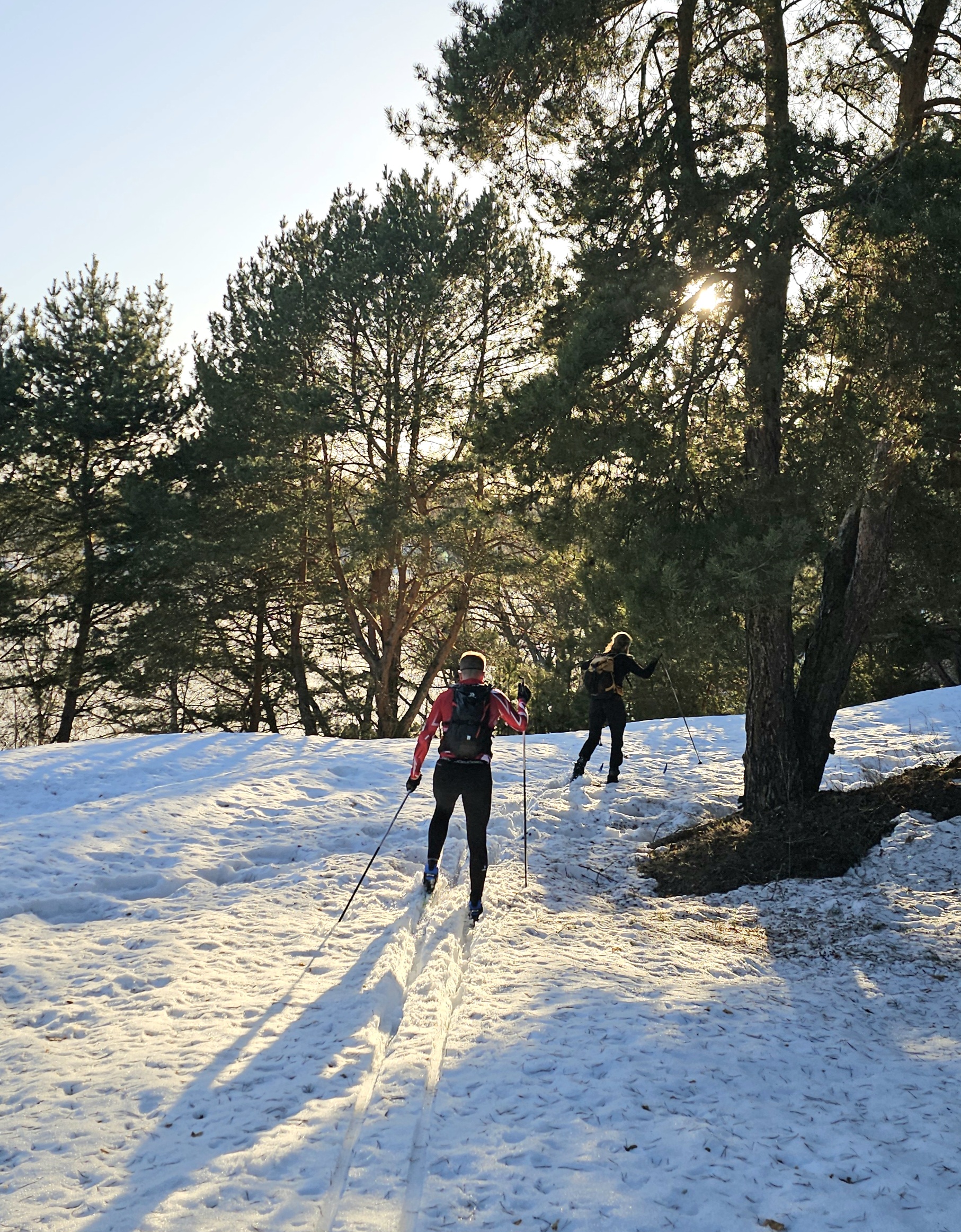 Берег затона Оки перед Белопесоцким. Под деревьями снег грязный, поэтому сильно нагревается и проваливается.
