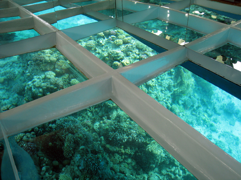 Морское дно через стеклянное дно лодки.