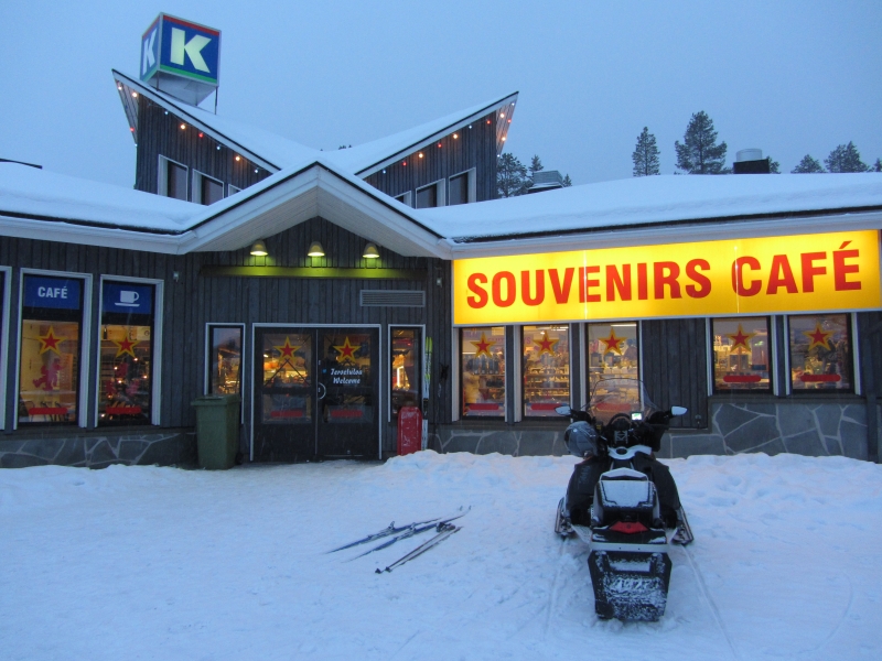 У входа в супермаркет народ оставляет транспортные средства - снегоходы и лыжи.