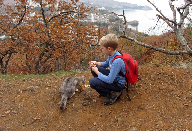 "Артекская тропа" на Аю-Даг. Алеша кормит кота.