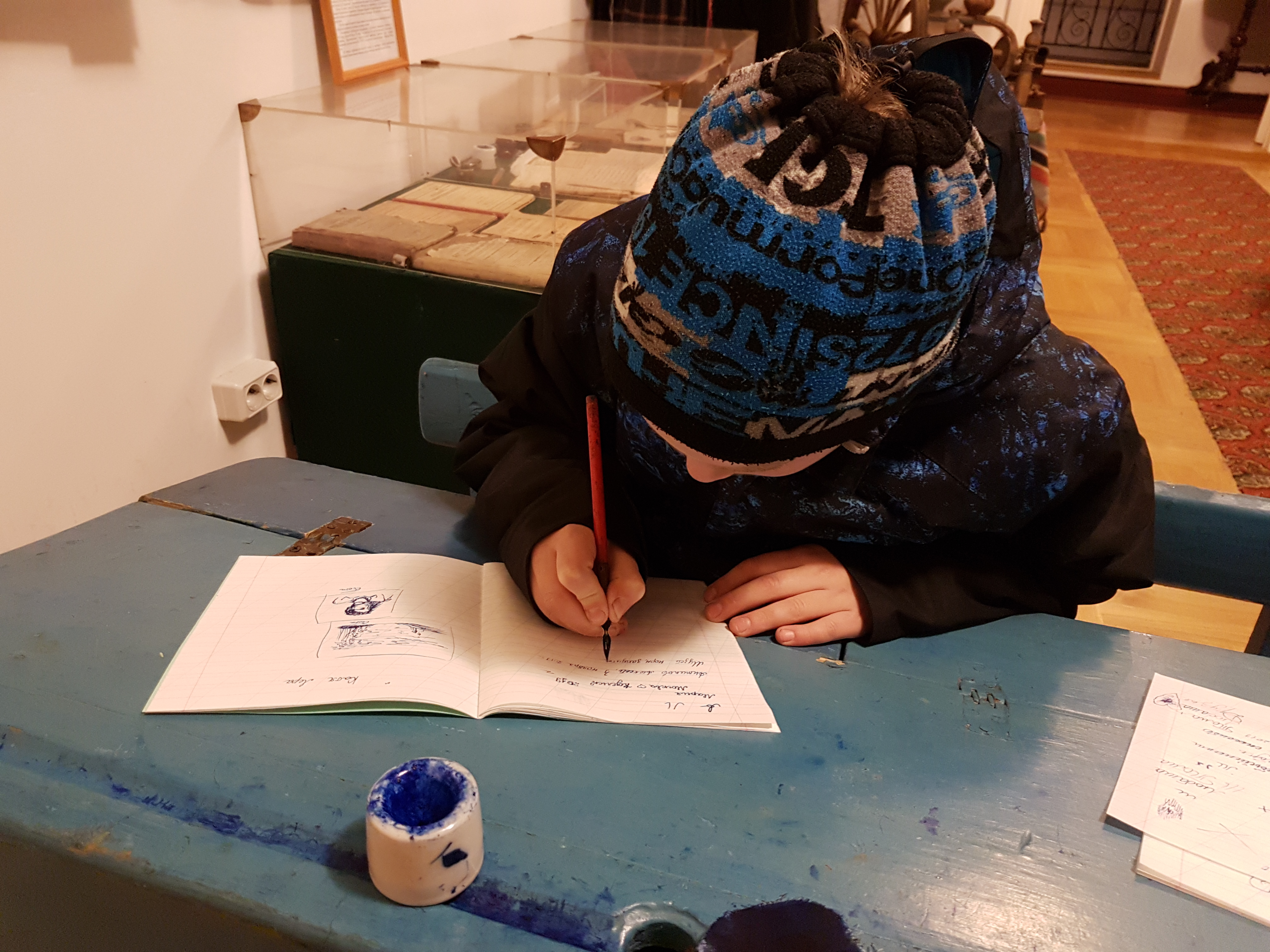Алеша пишет отзыв перьевой ручкой.