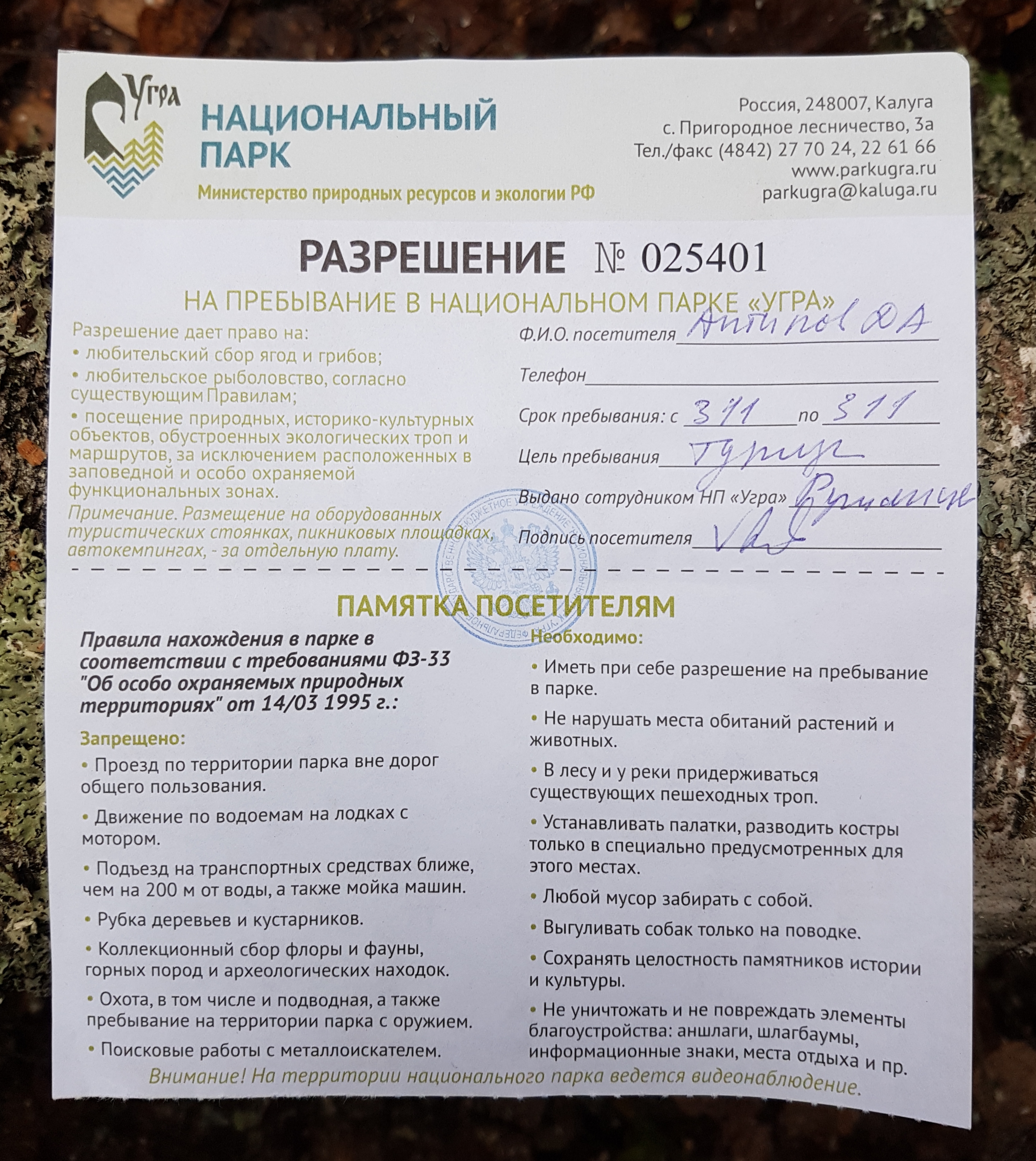 Разрешение на посещение нац.парка "Угра".
