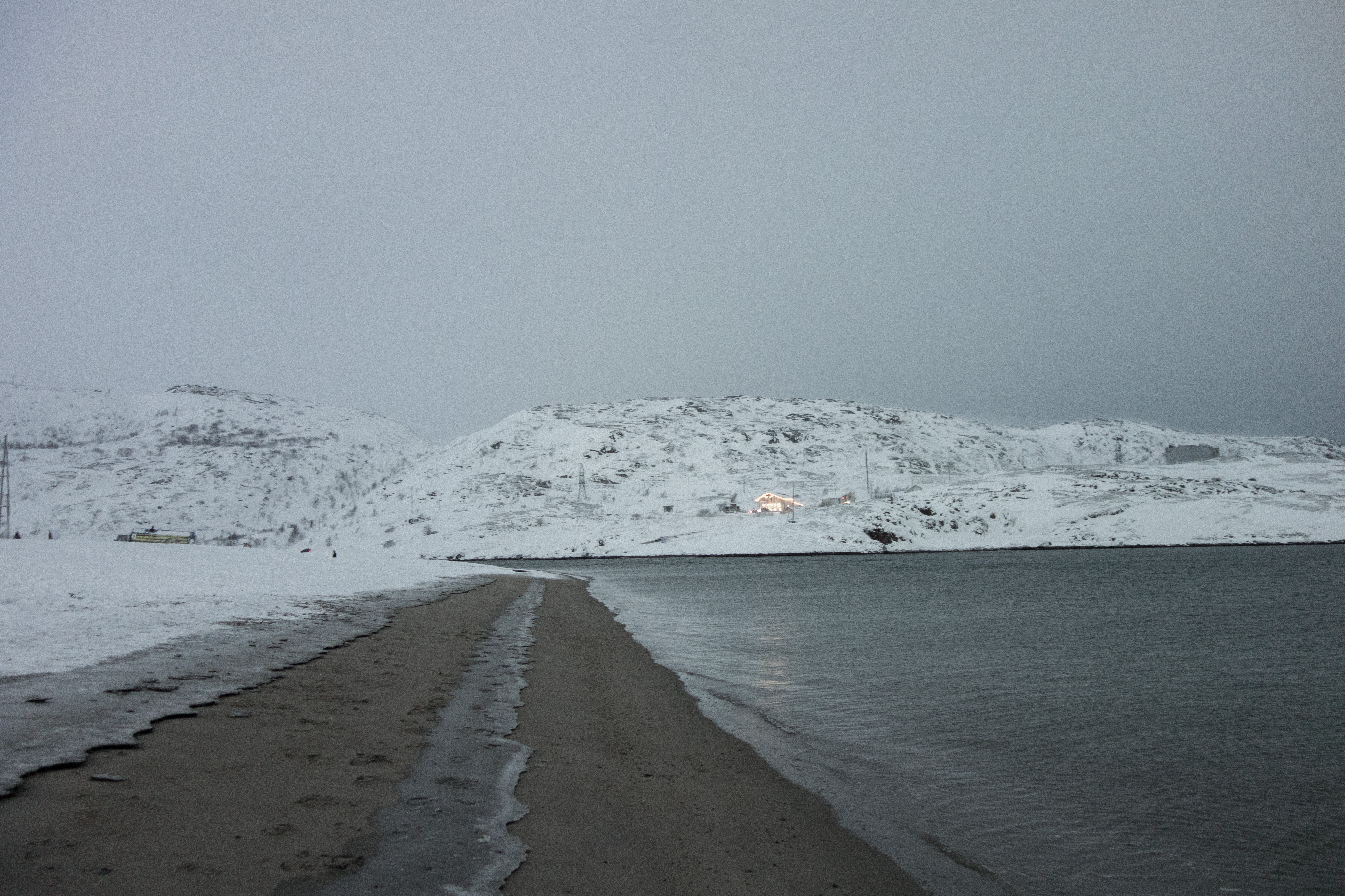 Песчаный пляж в Териберке. Лодейная губа Баренцева моря.
