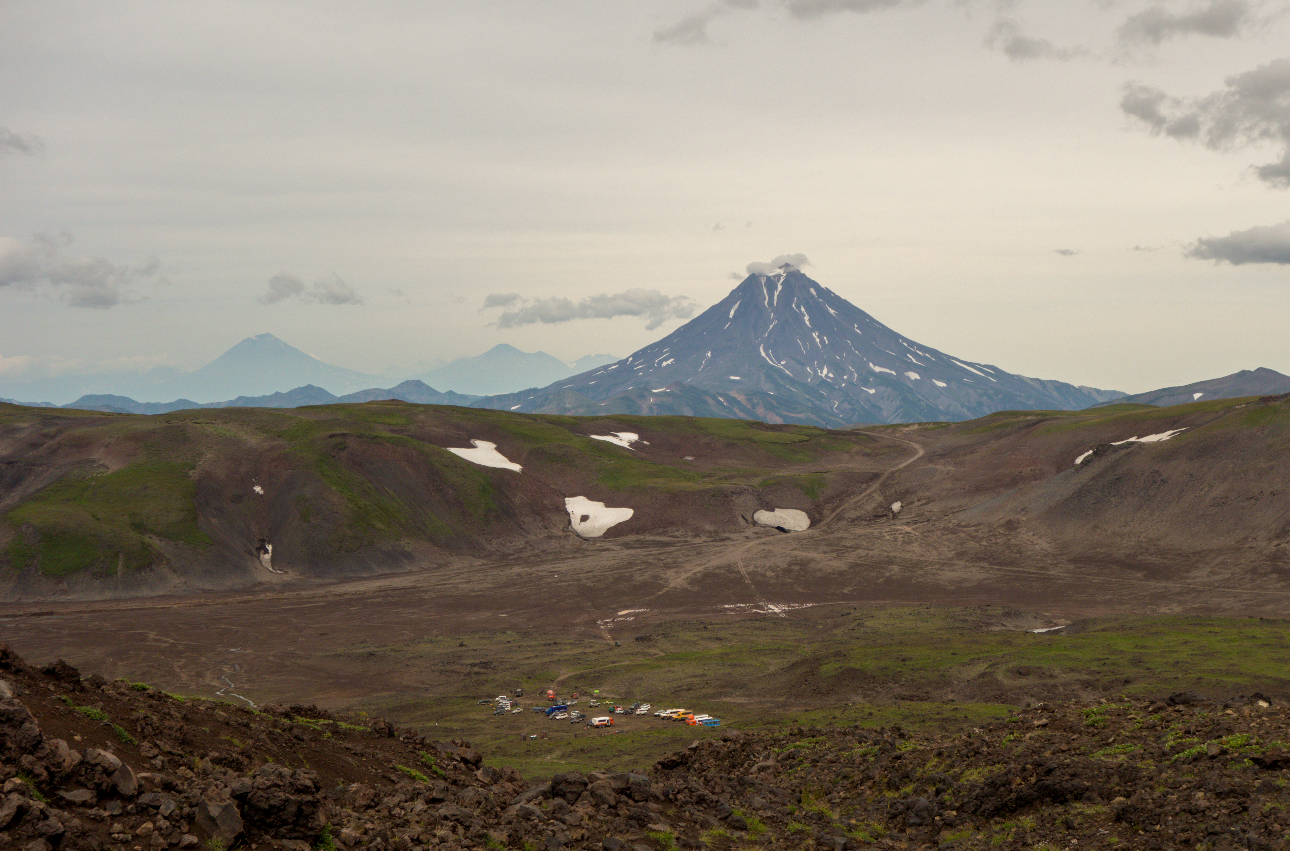 Виден Вилючинский вулкан и автостоянка, откуда мы начали подъем на Горелый.