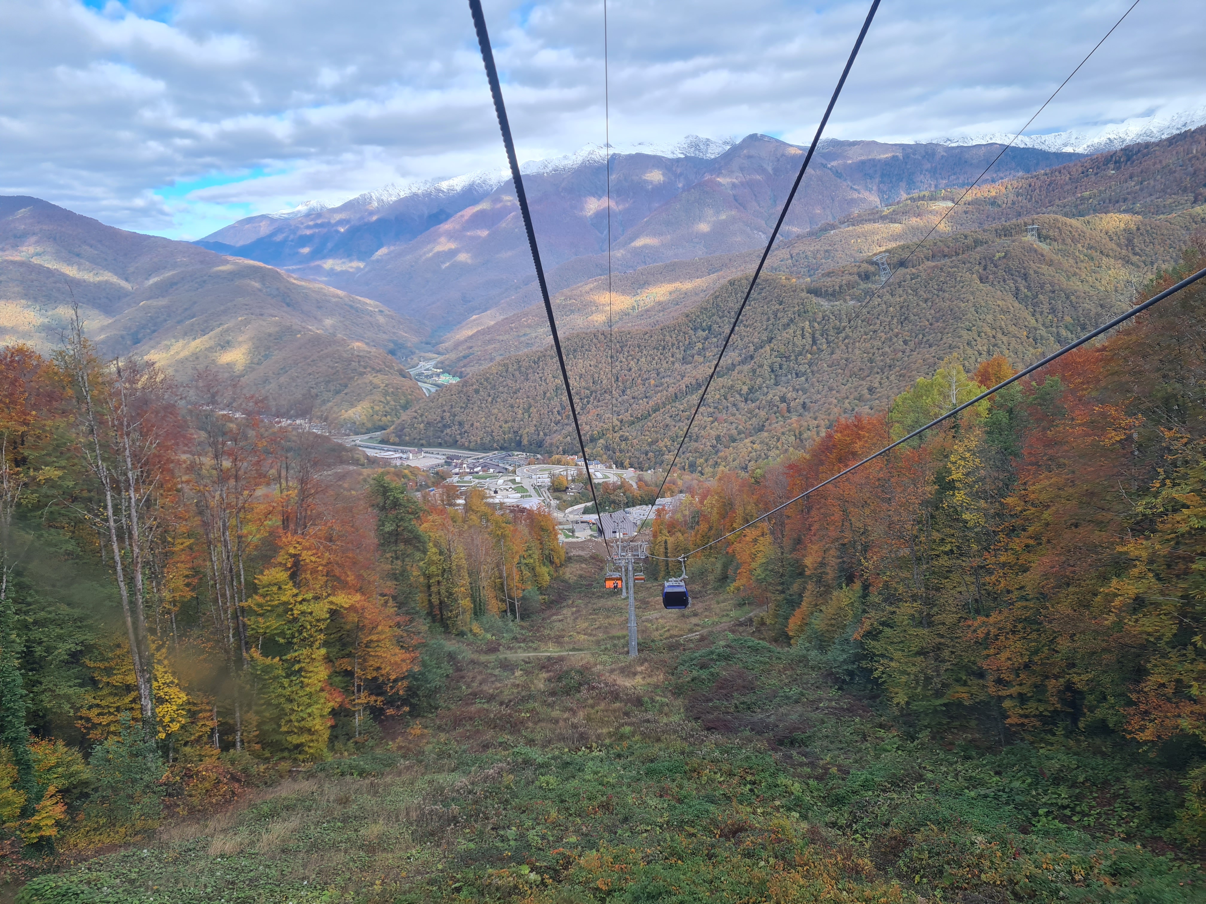 Вид с газпромовской канатки К1-К2-К3-К4-К5 при подъеме от нижней станции «Альпика 550 м» до верхней станции «Приют ветров 2256 м».