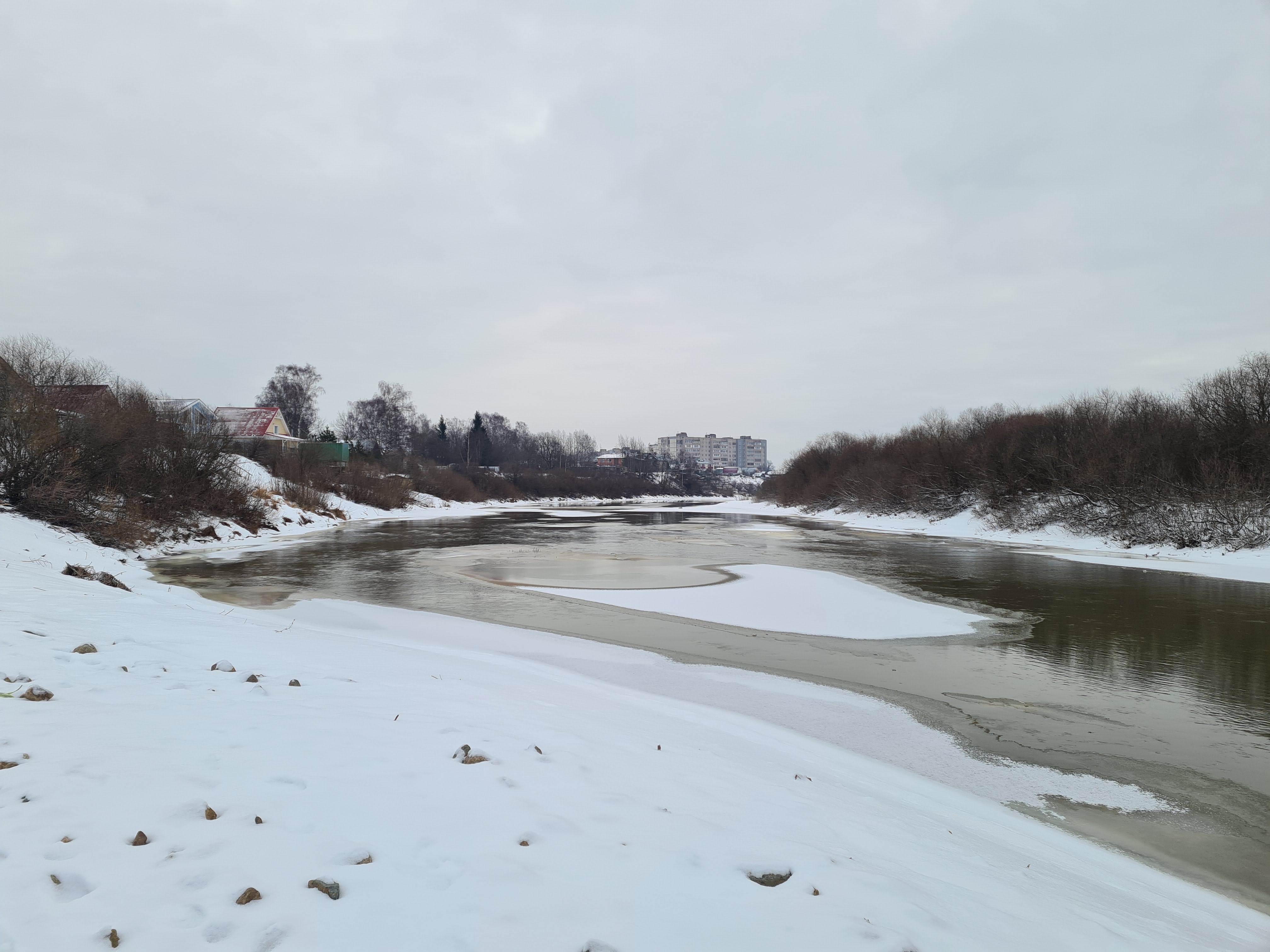 4 января 2025. Южнее автомобильного моста в Лукьянцево – открытая вода, объехать без шансов. Выходим на берег.