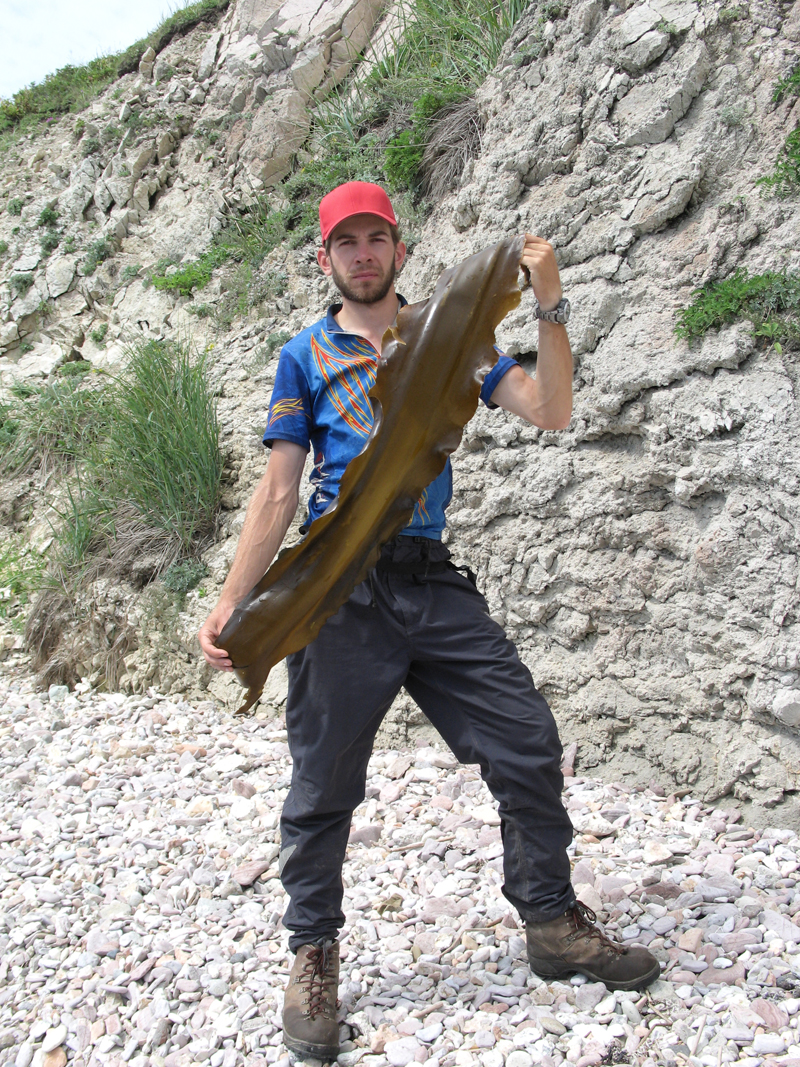 Славик с водорослью. По совету отдыхающих мы ее мелко порезали и отварили, прлучился редкостный бруль. Совсем не похоже на "Салат дальневосточный", который продают в банках.