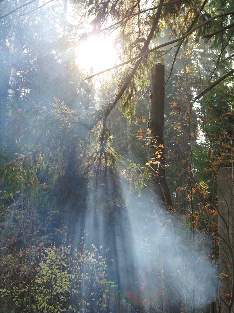 Утро 9 октября. Солнечные лучи сквозь деревья и дым костра.