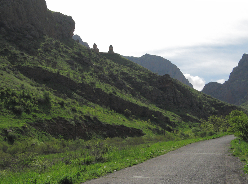 6 мая. Дорога к монастырю Нораванк (он виден слева на склоне).