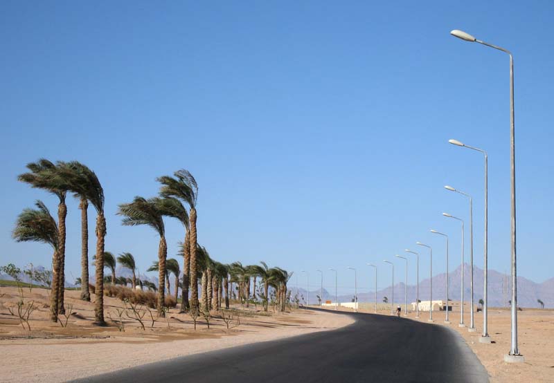 Выезд из отеля в сторону трассы. Сильный северный ветер, как видно по пальмам.