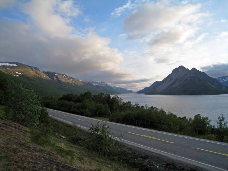 1 июля. Вид с места ночевки (за пос. Storsandnes) на фьорд Langfjorden и трассу Е6.