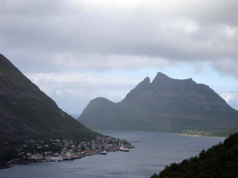 Вид на Gryllefjorden и поселок Gryllefjord со спуска с перевала Ballesvikskaret.