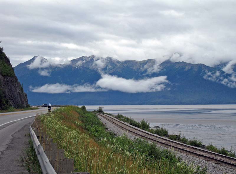 Вдоль залива Turnagain Arm параллельно шоссе проходит железная дорога.