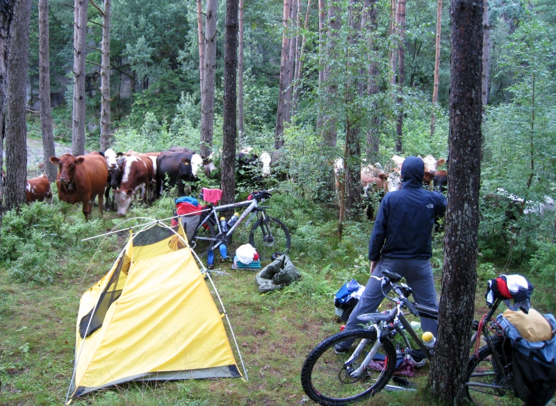 Вечер 24 июля, 3 км после Lyngdal. Нашу стоянку атаковали коровы.