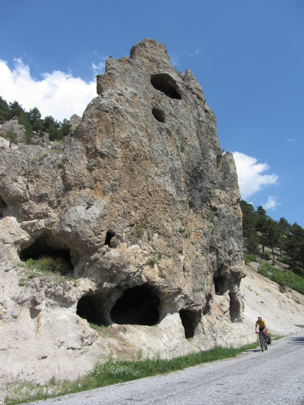 Скала с гротами у дороги в Капузбаши.