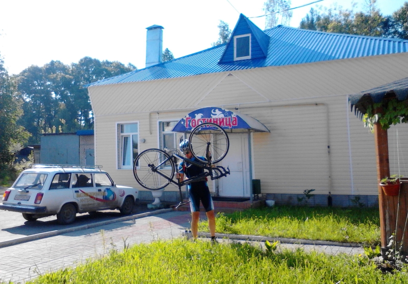 Утро 9 июня. Бежецк, гостиница "Старт". Дима выливает воду из рамы велосипеда.