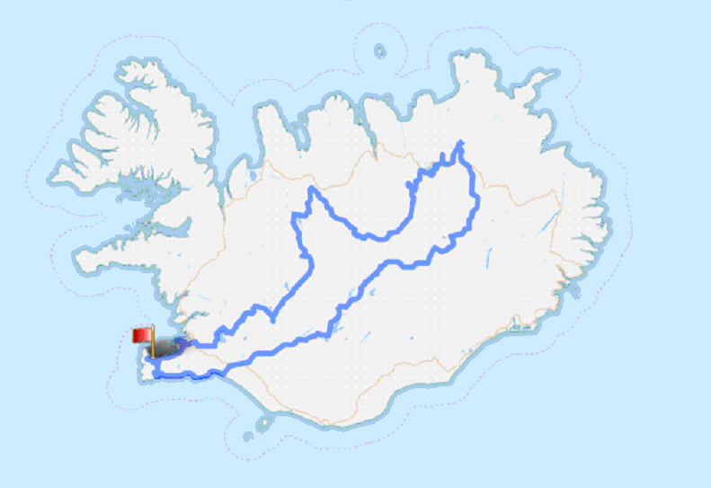 Keflavik (аэропорт) - Reykjavik - оз. Pingvallavatn - нац.парк Thingvellir - Gjabakki - Porolfsfell - водопад Gullfoss - Arbudir - термальная площадка Hveravellir - озеро Blondulon - Hviteyrar - Maelifell - озеро Stafnsvotn - Laugafell - водопад Aldeyjarfoss - Bolstadur - Engidalur - озеро Myvatn (с юго-востока: мыс Skutustadir, дендропарк Hofdi, "Черная крепость" Dimmuborgir, вулкан Hverfjall), Reykjahlid - термальное поле Hverir - вулкан Krafla - водопады Detifoss и Selfoss - Dreki - лавовое плато Odadahraun, вулкан Askja, озера Okjuvatn и Viti - Dreki - ледник Vatnajokull - озеро Porisvatn - Hrauneyjar - Selfoss - Porlakshofn - Strandarkirkja - Grindavik - Blue Lagoon - Keflavik (аэропорт).