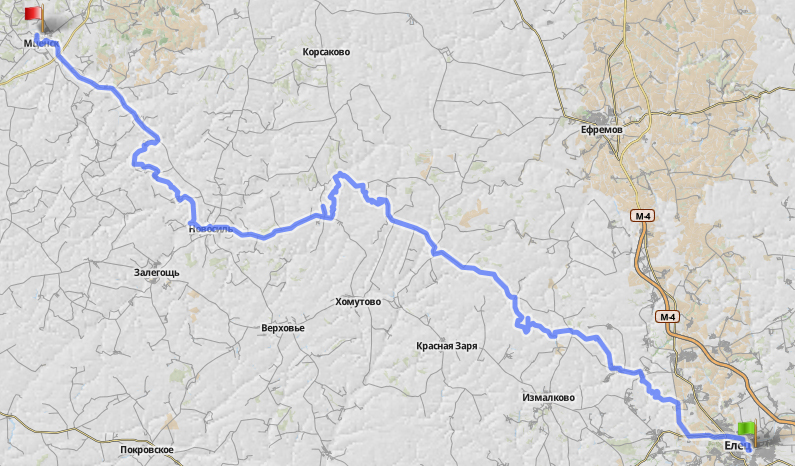 ЕЛЕЦ - мост через р.Паженку - р.Воргол - Баевка - Кириллово - Дмитриевка - Адоньево - Знаменское - Лутовиновка - Новая - Кр.Октябрь - Домны - Судбищи - Переволочиновка - Раковенское - Крыловка (пруд) - Красное Озеро - р. Раковка (ночевка) - Агибалово - Казинка - Шатилово - Р120 - Долы - Шейнский мост - Новосиль - Задушное - Вяжи - Одинок - вдоль р.Зуши - Глубки - Городилово - Хапово - Прилепы - Жашково - брод через р.Колпну - Становое - Чернь - МЦЕНСК.