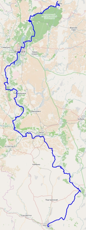 РОССОШЬ - Алейниково - Саприно - Белогорье - Верх.Карабут - берег Дона (1-я ночевка) - Колодежное - Костомарово - Марки - ЛИСКИ - Дивногорский Успенский мужской монастырь - музей-заповедник ДИВНОГОРЬЕ - Коротояк - Гостинный - берег реки Потудань вблизи устья (2-я ночевка) - Девица - Урыв-Покровка - Титчиха - Сторожевое 1-е - Архангельское - Борщево - Костёнки - берег Дона (3-я ночевка) - ВОРОНЕЖ - Боровое - Маклок - Рамонь - Ступино - Пчельники - Беляево - УСМАНЬ.