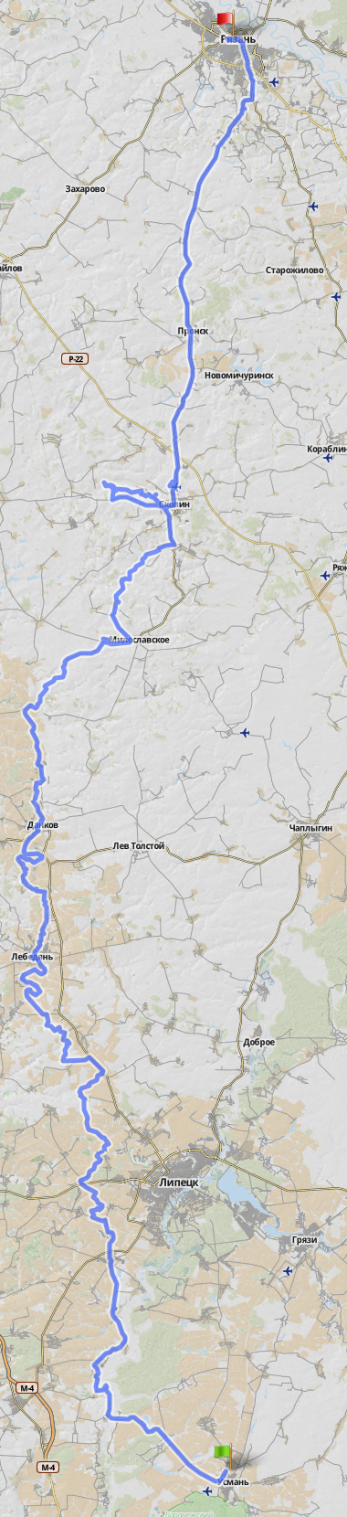 УСМАНЬ - Поддубровка - Боринское - Сенцово - Вешаловка - Сухая Лубна - Волотовские Дворики - р.Дон (ночевка) - ЛЕБЕДЯНЬ - ДАНКОВ - Долгое, р.Дон (ночевка) - Змеёвка - Милославское - Спасское - Секирино - Скопин - источник - Лопатино - СКОПИН - база отдыха "Успенские дали" (ночевка рядом) - Пронск - РЯЗАНЬ.