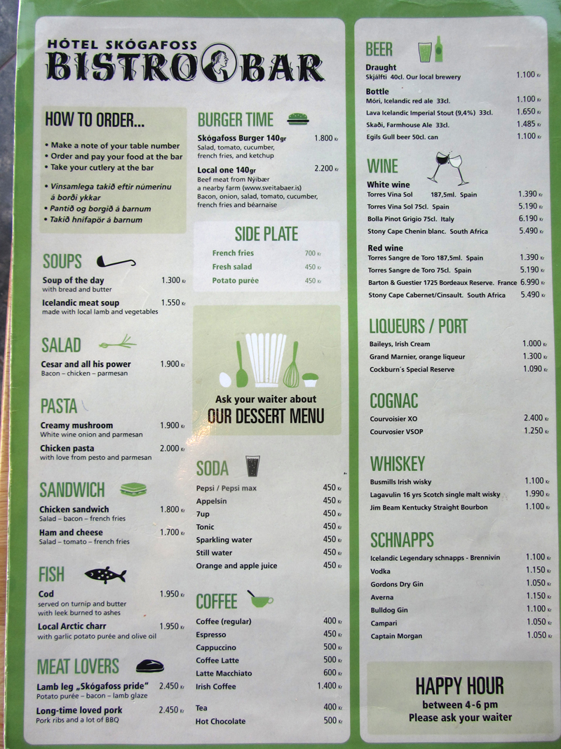 Skogar. Меню ресторана отеля Skogafoss.