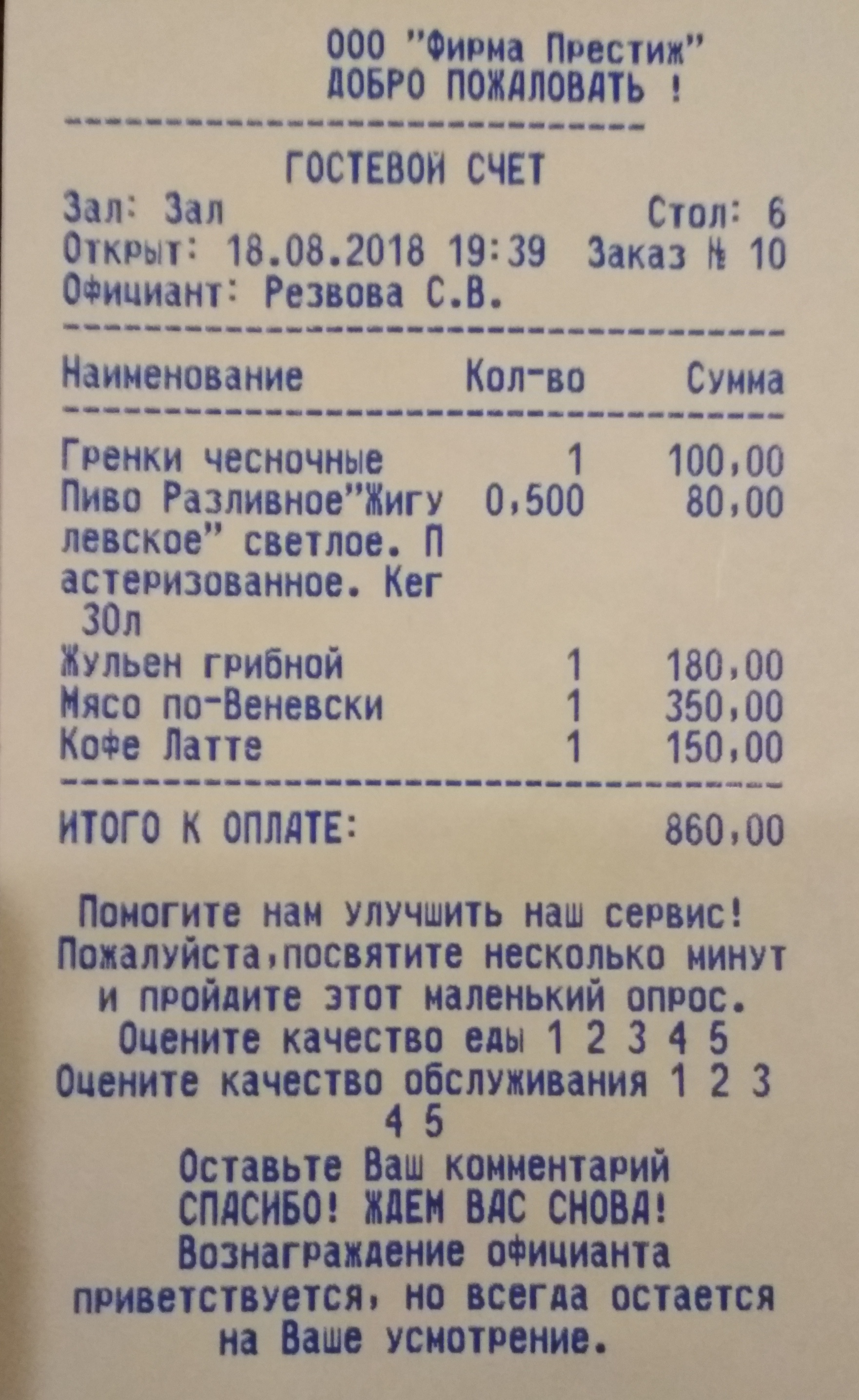 Венёв. Счет из ресторана "Трюфель".