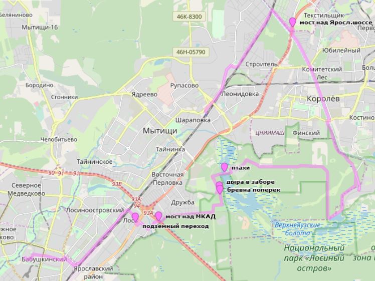 17 апреля 2019Дом - Лосиный Остров - Акуловский водоканал - Королев - Челюскинская - Мытищи Трек (файл .gpx для скачивания, 34 км) Трек nakarte |