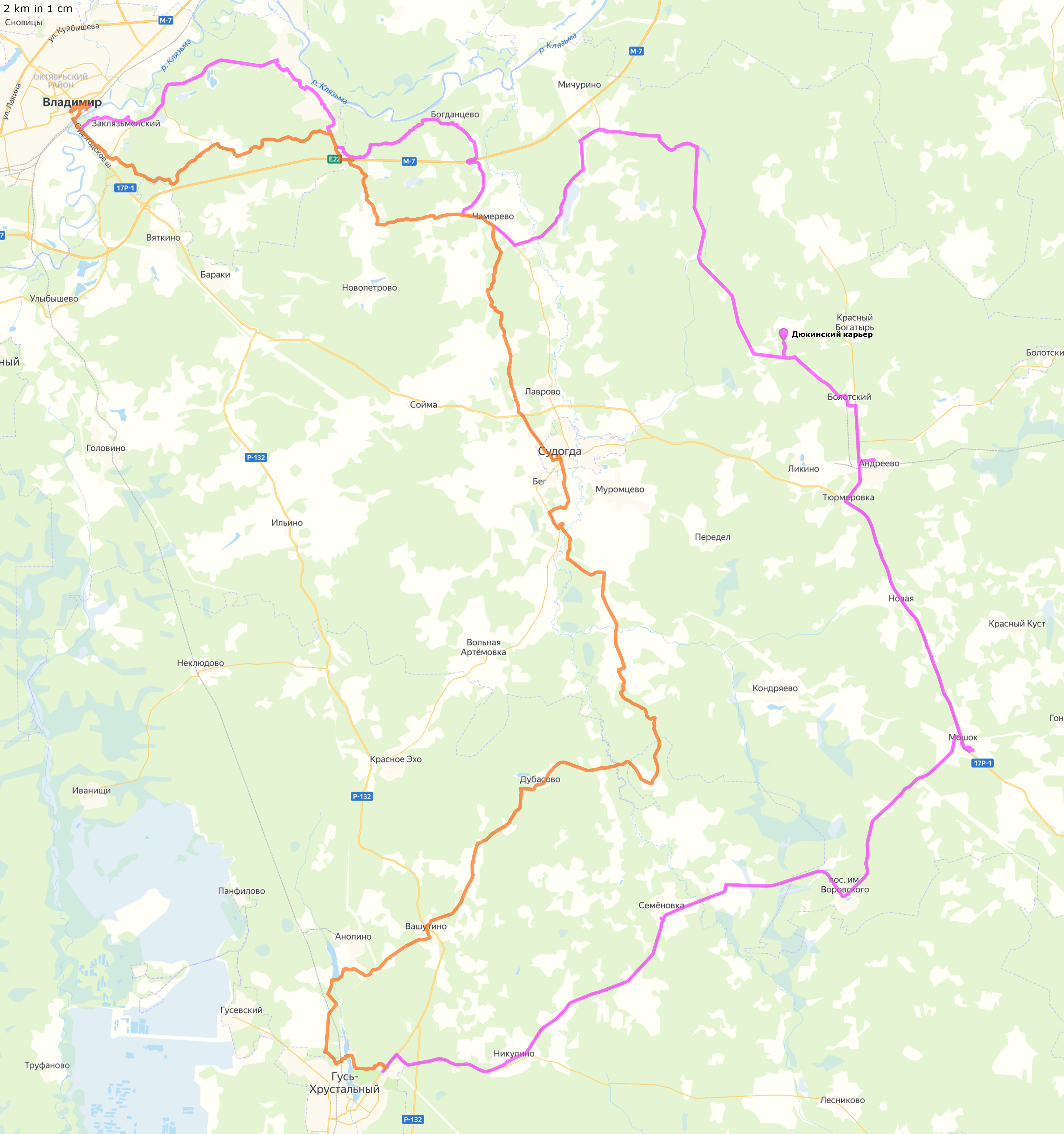 24-25 октября 2020Владимирская область Владимир - Дюкинский карьер - Андреево - пос.им.Воровского - Гусь-Хрустальный (ночёвка в гостинице) - Судогда - Владимир Трек и точки (файлы .gpx для скачивания, 154+118 км) Трек и точки nakarte Трек и отчёт в Strava Некоторые фото в моём ФБ |