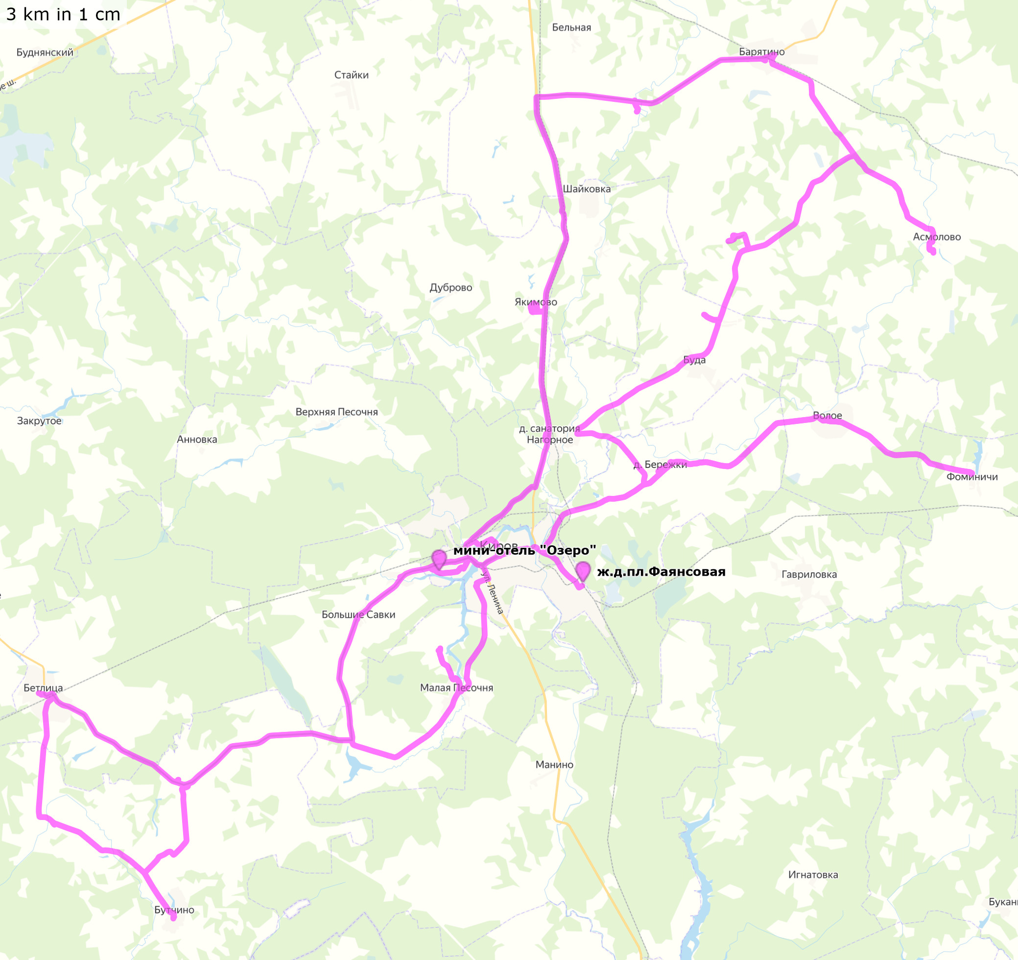 Фаянсовая - Киров (ночёвка в гостинице) - Фоминичи – Барятино - Киров (ночёвка в гостинице) – Бутчино – Бетлица - Киров - Фаянсовая Трек и точки (файлы .gpx для скачивания, 10+156+102 км) Треки и точки nakarte Треки и отчеты в Strava: день 1, Киров – Фоминичи – Барятино - Киров, 156 км; день 2, Киров – Бутчино – Бетлица - Киров - Фаянсовая, 102 км |
