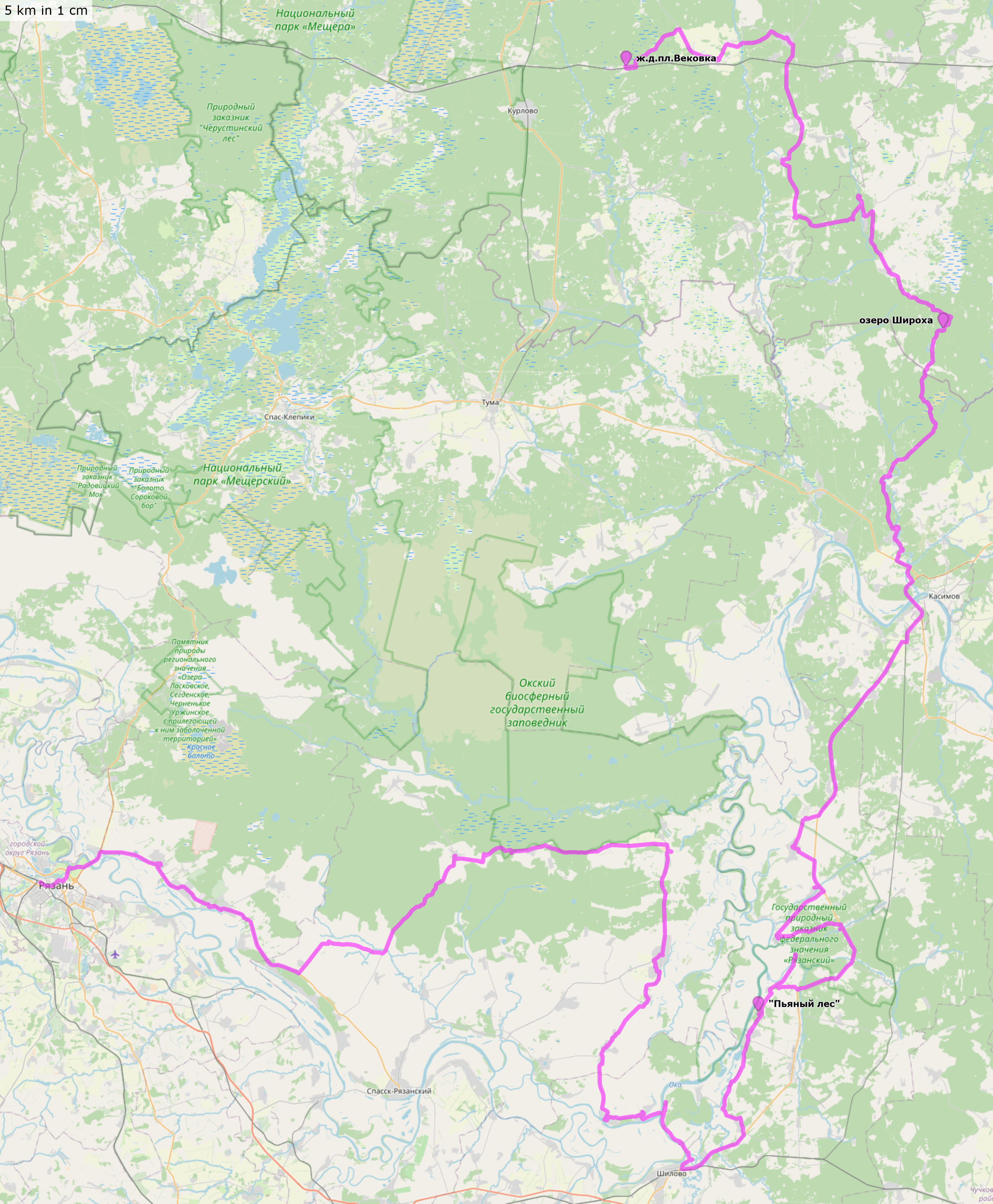 12-14 июня 2021Рязанская и Владимирская областиРязань-1 - Шилово - аномальная зона «Пьяный лес» - Касимов - озеро Широха - Вековка Трек и точки (файлы .gpx для скачивания, 159+168+88 км) Трек и точки nakarte Трек и отчет в Strava Некоторые мои фото в моём ФБ |