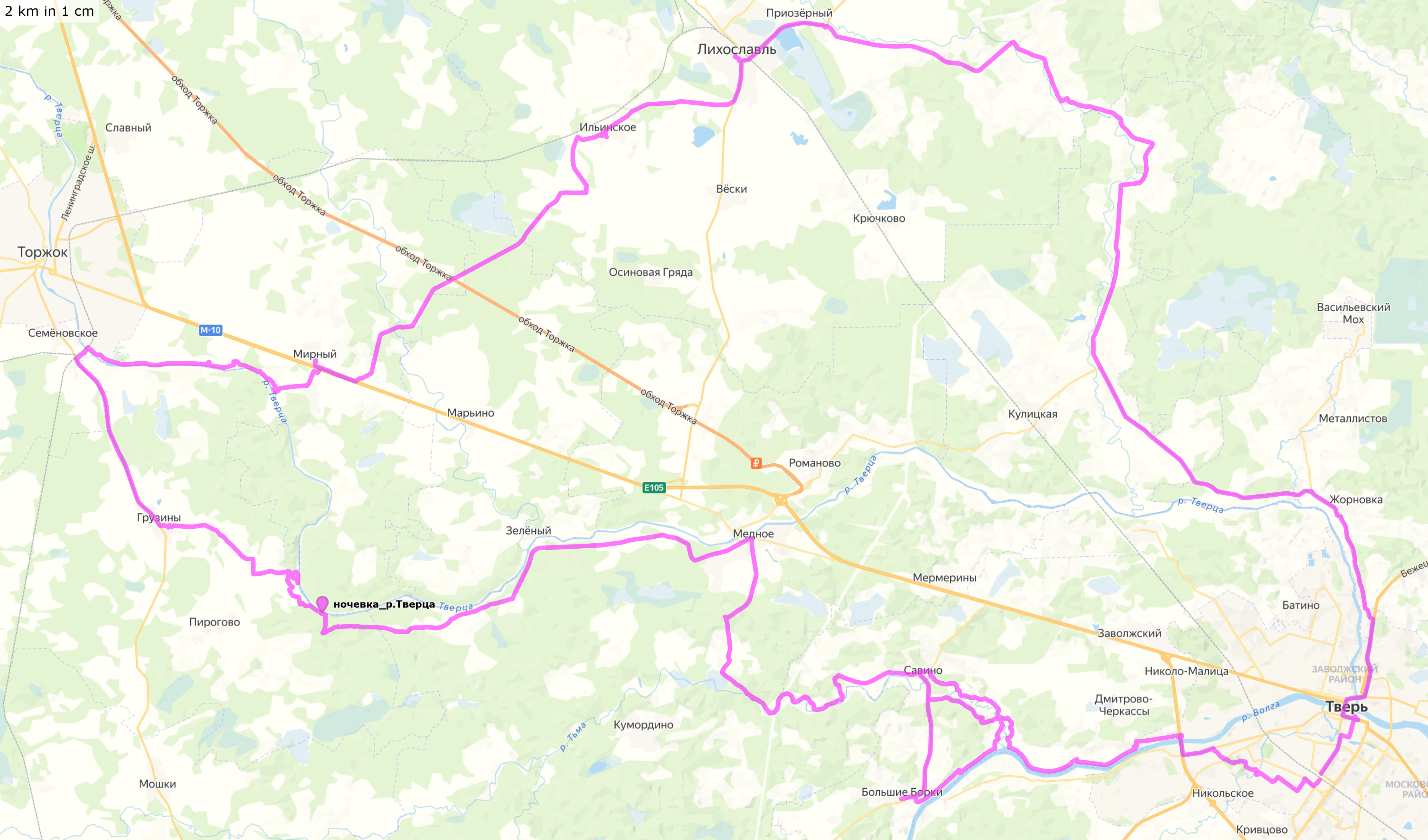 Тверь - река Кава - Лихославль - Мирный - река Тверца - Грузины - Медное - река Тьма - Савино - Большие Борки - река Волга - Тверь