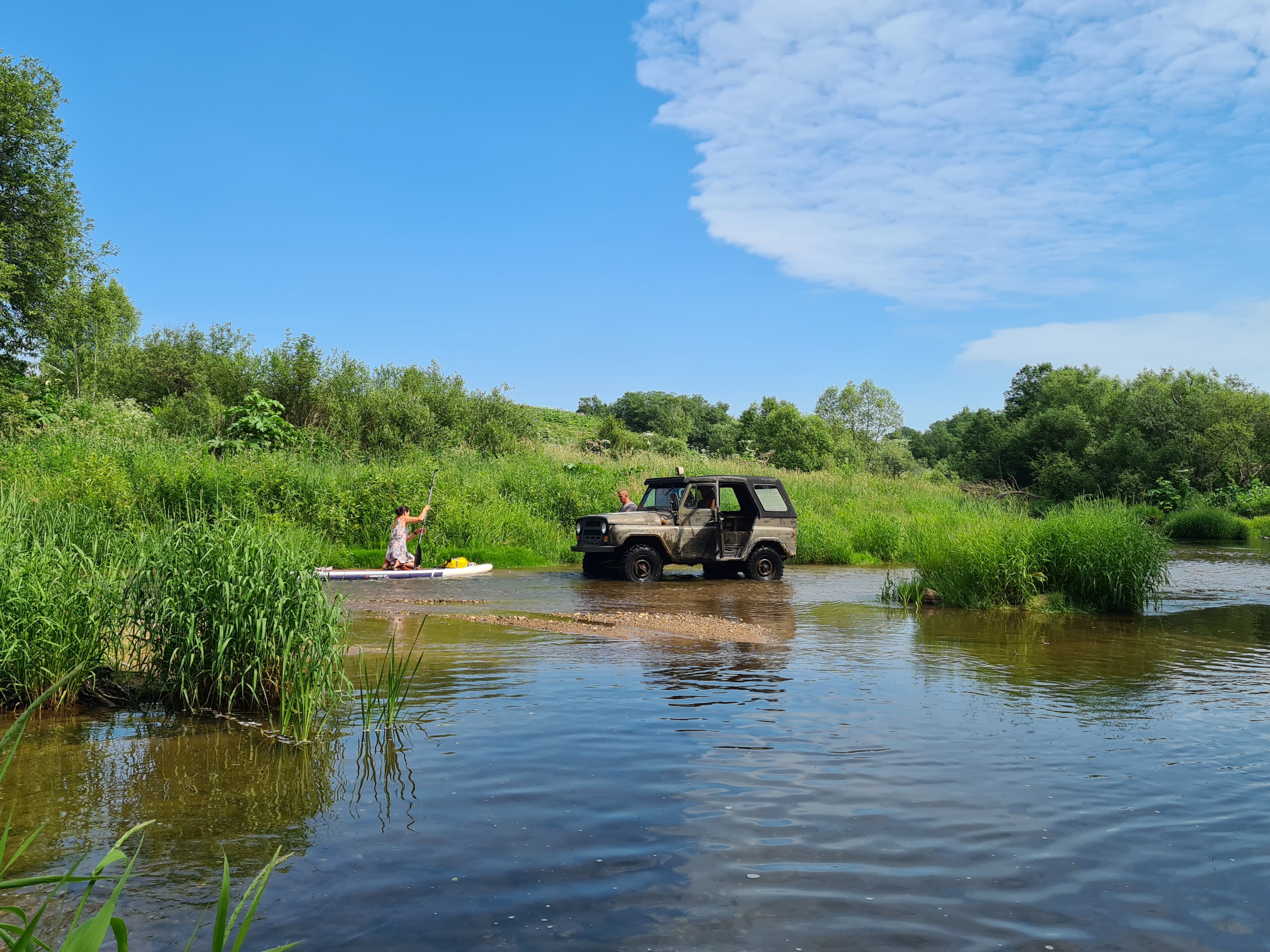 Местный мужик заехал в реку, чтобы помыть свою машину.