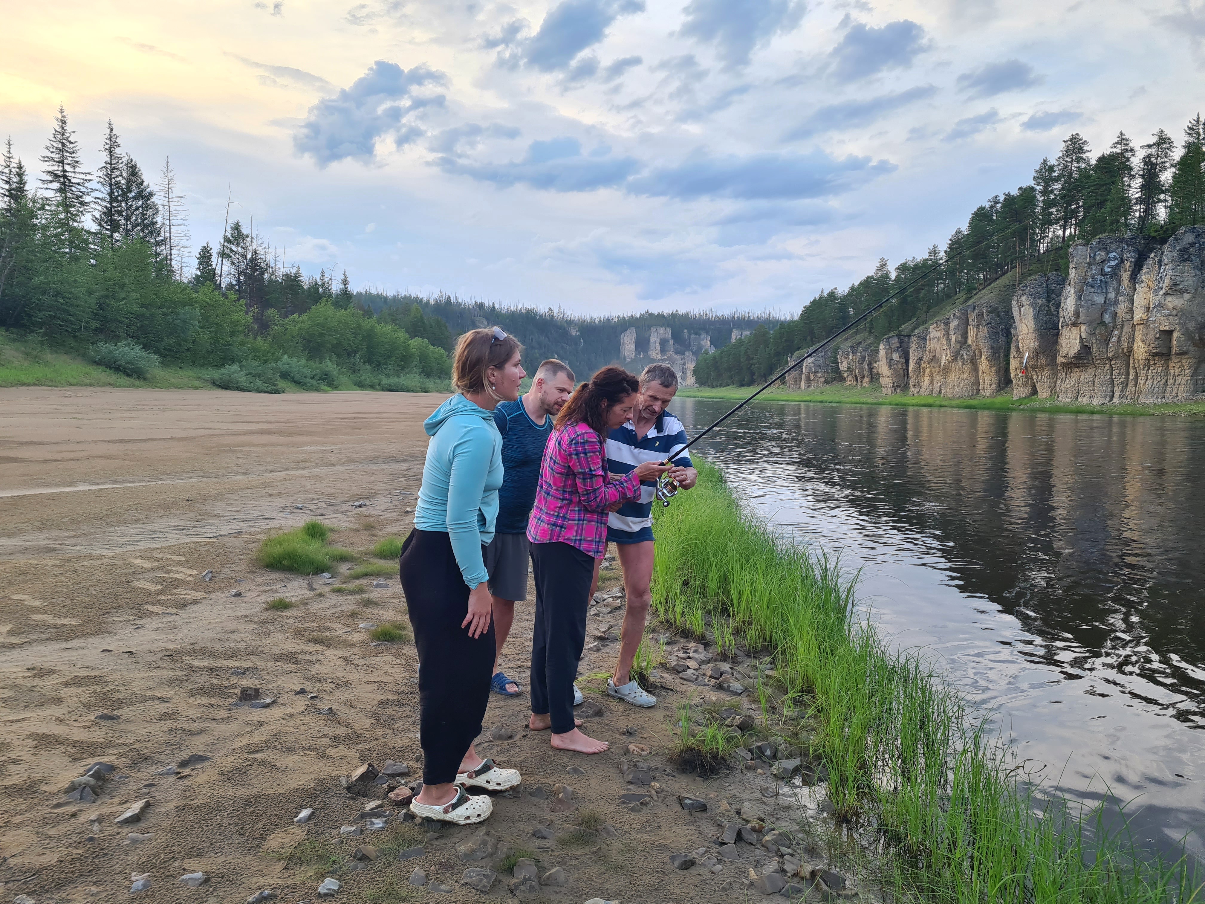 Андрей обучает желающих ловить рыбу.